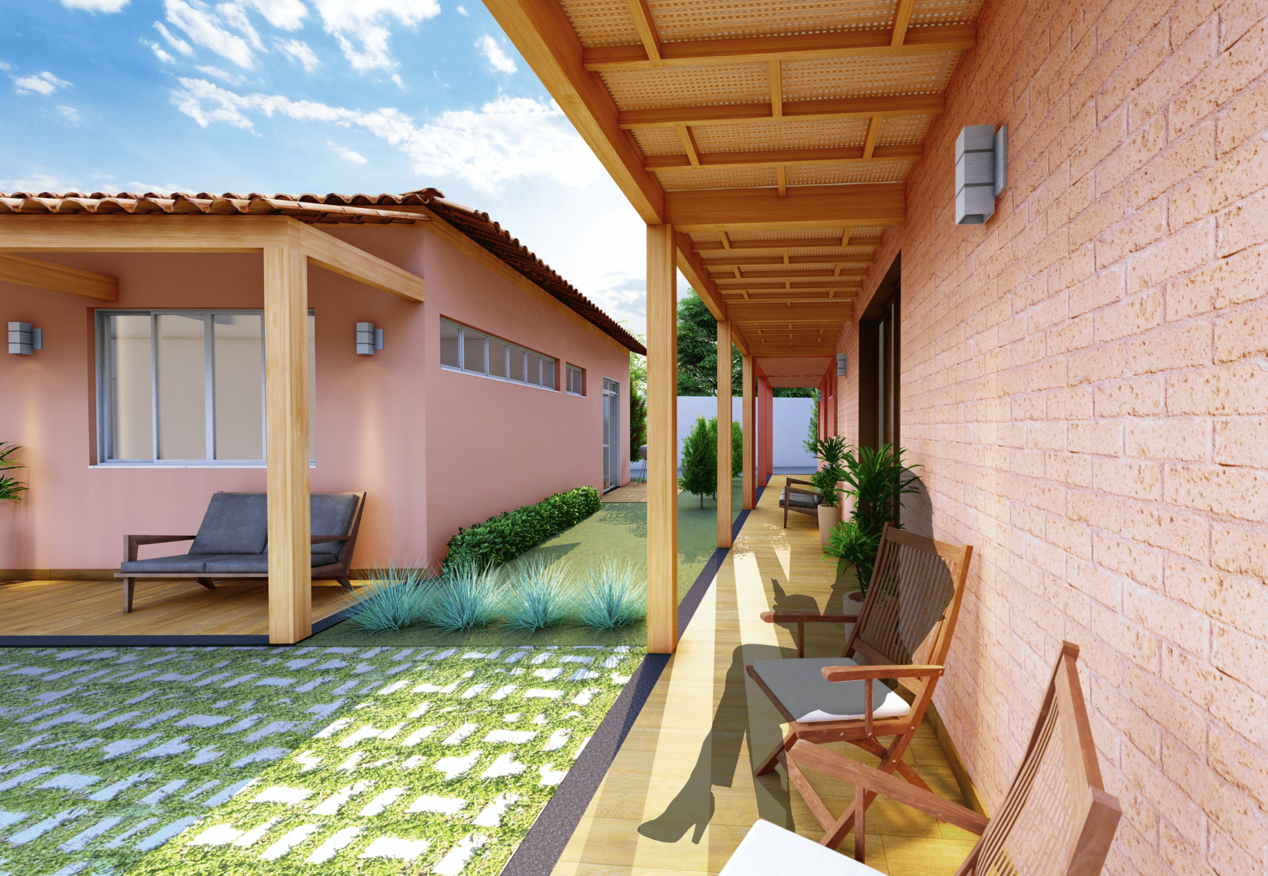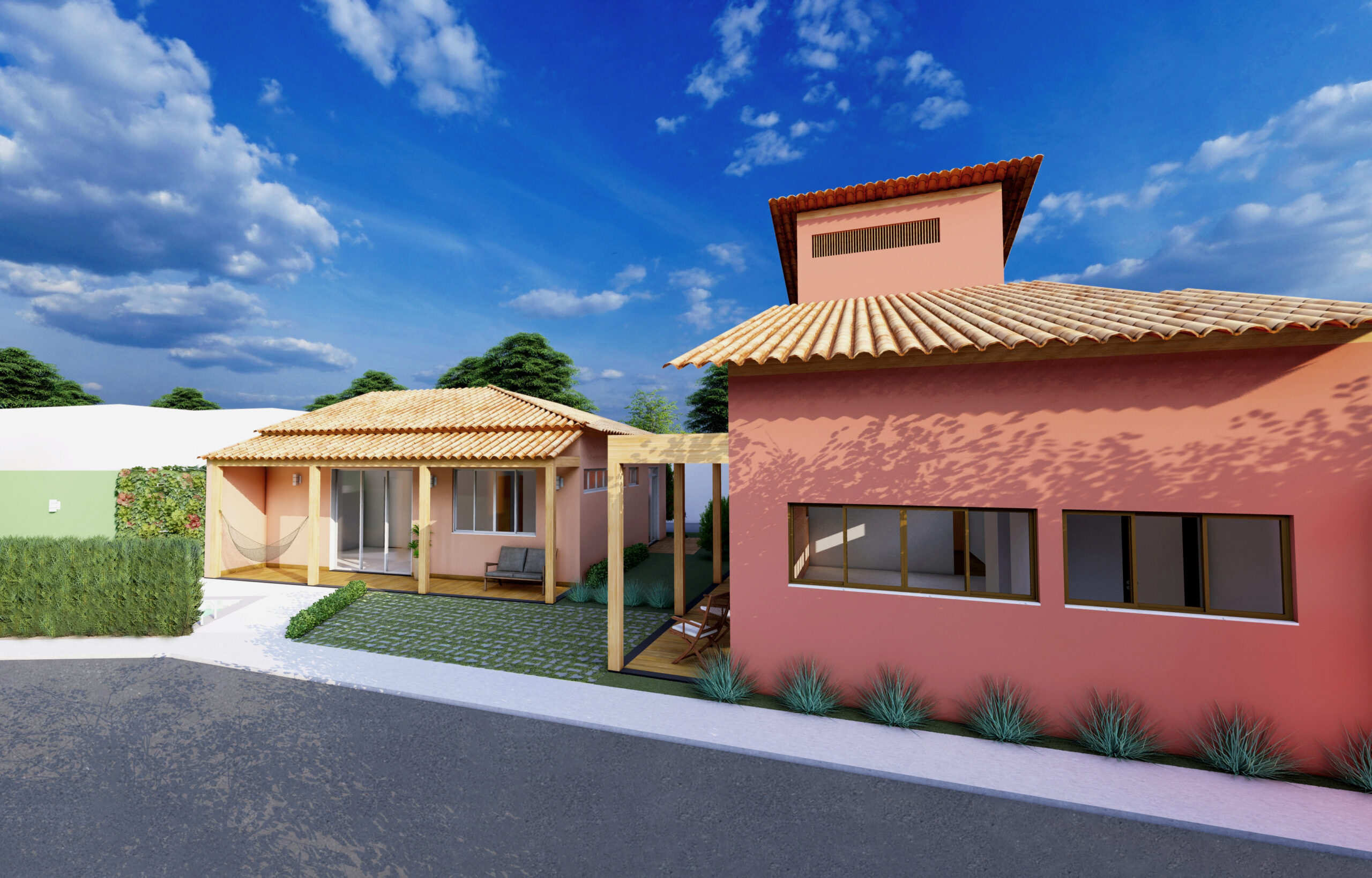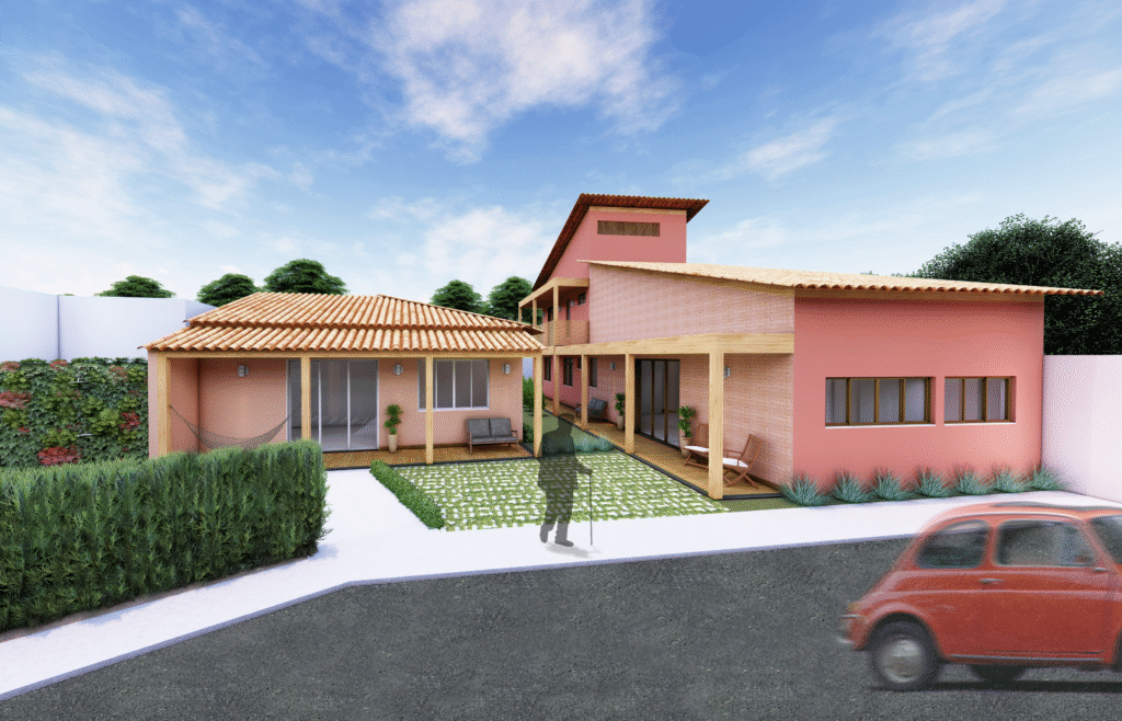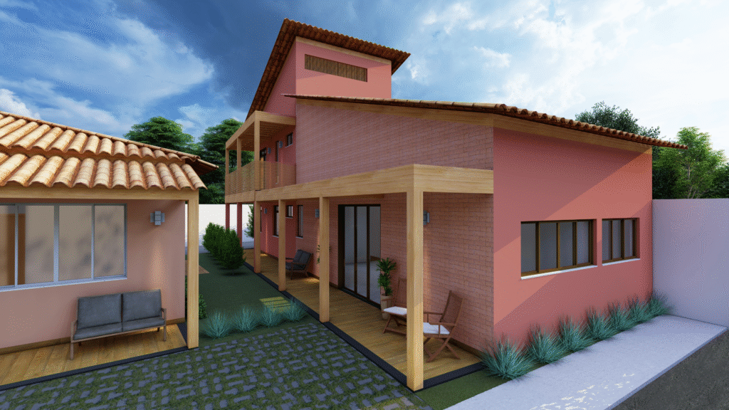 A arquitetura das casas combina referências rústicas e soluções contemporâneas. Tons de terracota, tijolinho aparente, madeira, telhado cerâmico, alpendres e forro de palha evocam as casas de fazenda, dialogando com pergolados e jardins, que reforçam a fluidez entre interior e exterior. Ao mesmo tempo, os ambientes integrados (estar-jantar-cozinha) refletem o modo de vida contemporâneo dos moradores, unindo funcionalidade e aconchego.