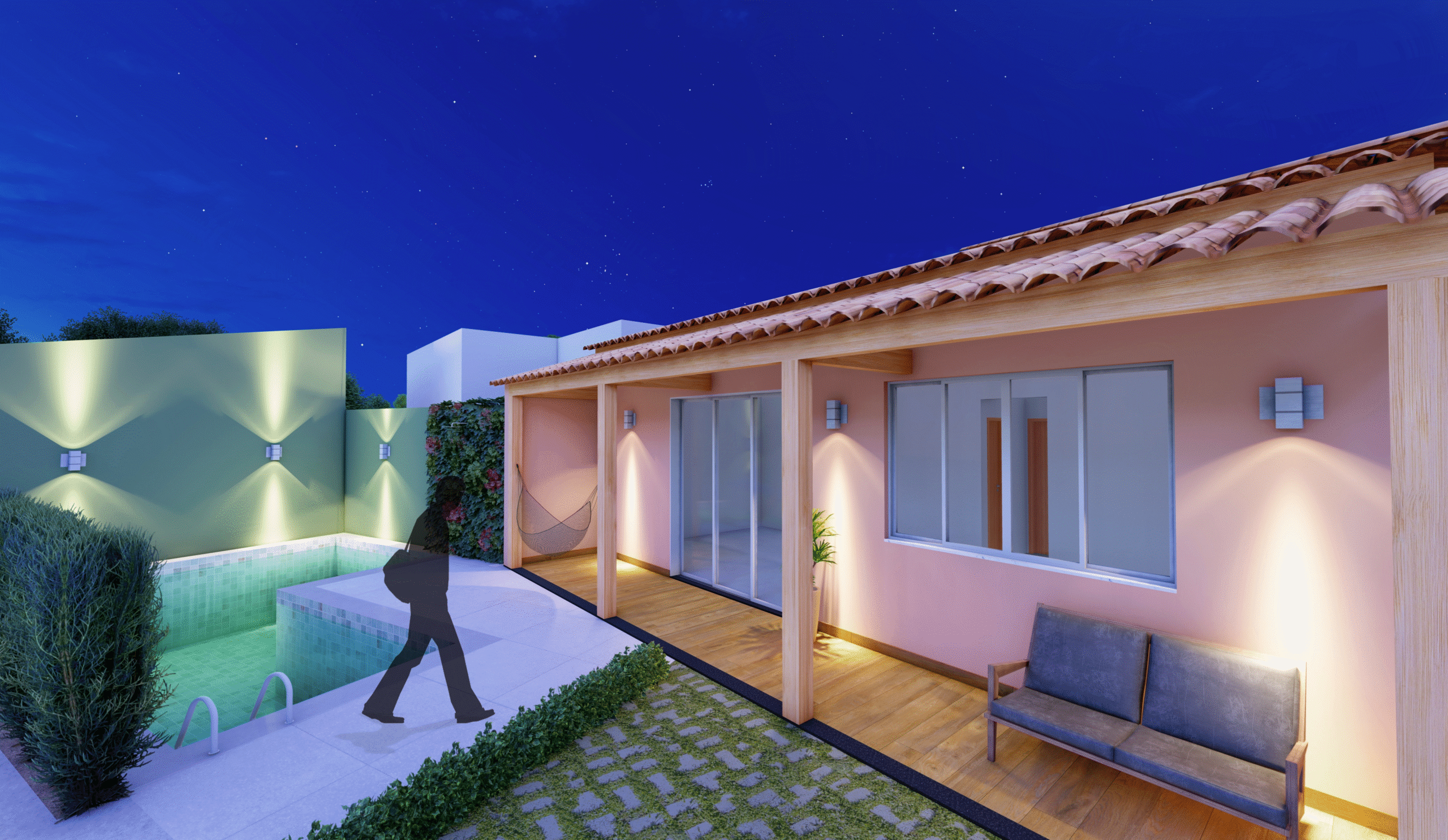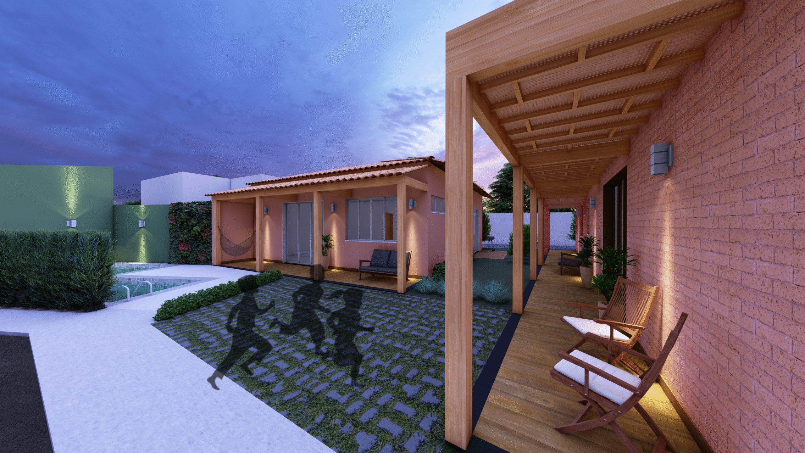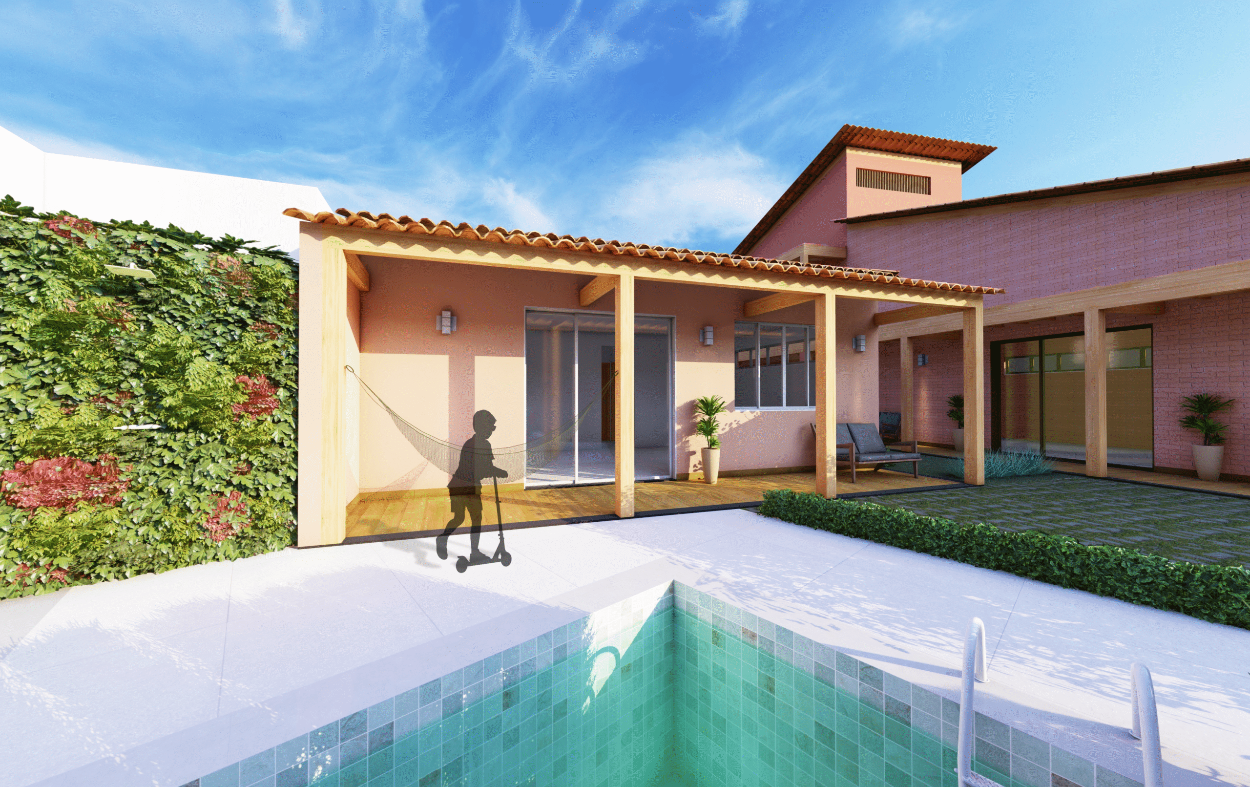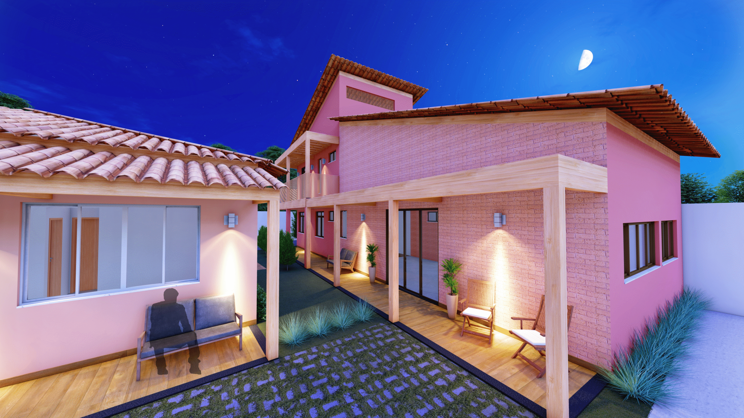 A arquitetura das casas combina referências rústicas e soluções contemporâneas. Tons de terracota, tijolinho aparente, madeira, telhado cerâmico, alpendres e forro de palha evocam as casas de fazenda, dialogando com pergolados e jardins, que reforçam a fluidez entre interior e exterior. Ao mesmo tempo, os ambientes integrados (estar-jantar-cozinha) refletem o modo de vida contemporâneo dos moradores, unindo funcionalidade e aconchego.
